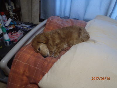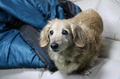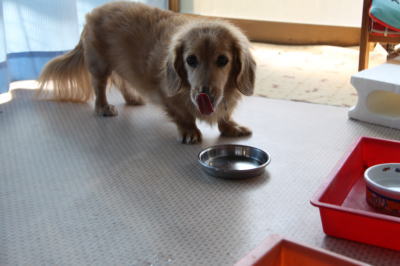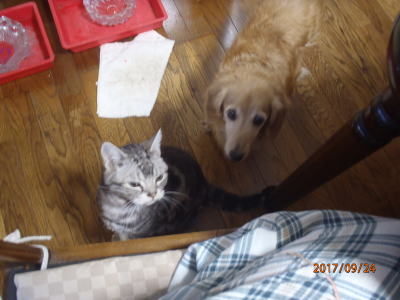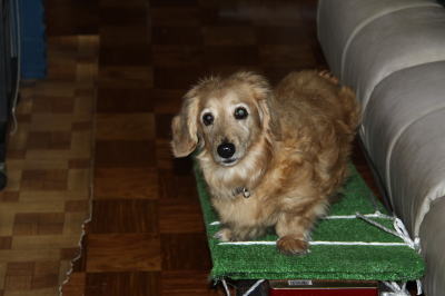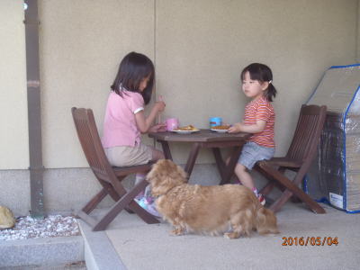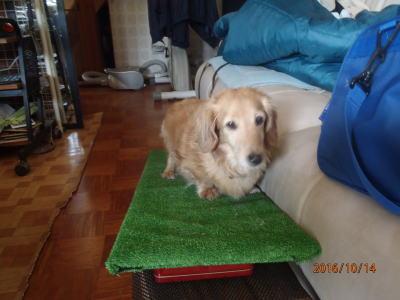 | 後ろ足の脚力が落ち、長椅子にはスロープを | 孫のおやつタイムのお邪魔をして |