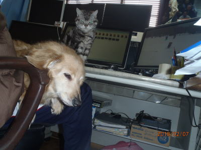 | 居間の座椅子で昼寝 | ご主人の仕事場で 主人の膝の上でくつろいでいる |
