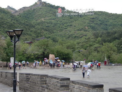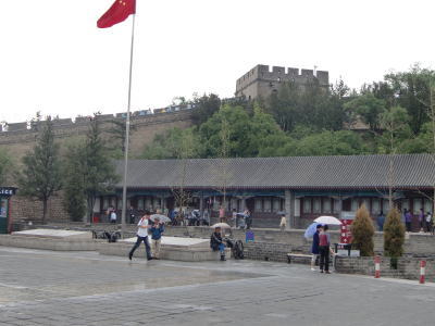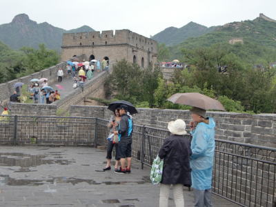 万里の長城へ向かう途中、急に大雨が降りバスから降りられない状態であったが、徐々に小雨になり、入口付近に来た時は傘がいらに状況に好転し幸いした。