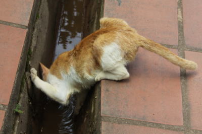 | 上手に水を飲む猫 こんな風に水を飲む猫を見たのは初めて (片手で身体を支え、人が近づいても逃げない) |