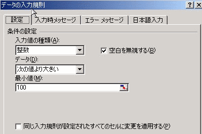 セルに100以上の入力を求め、100以下の数値が入力された場合エラーメッセージを表示します。