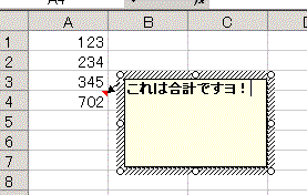 これが、セルのコメントを入れるボックスです。文字が自由に入力できます。